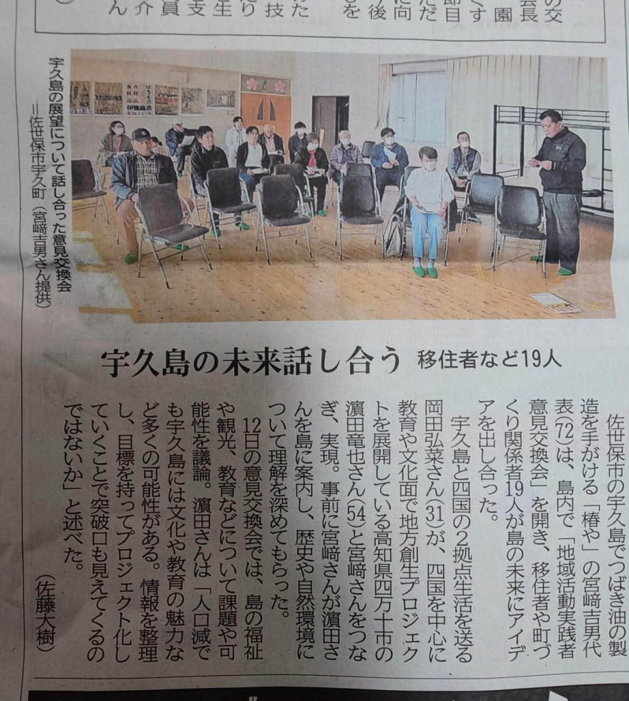 長崎新聞(26年3月19日付)にて、椿や(宮﨑代表)主催の宇久島の将来について話し合う意見交換会の様子が報じられました。