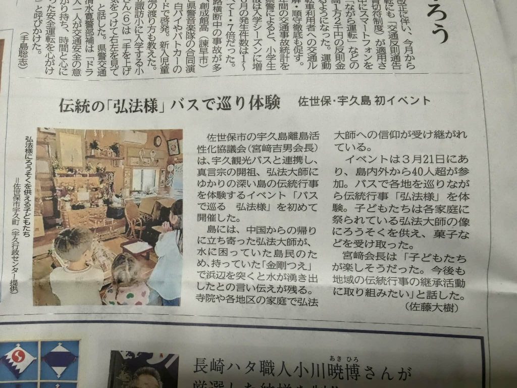 長崎新聞にて、宇久島の伝統行事「弘法様」を体験するイベントの様子が紹介されました。